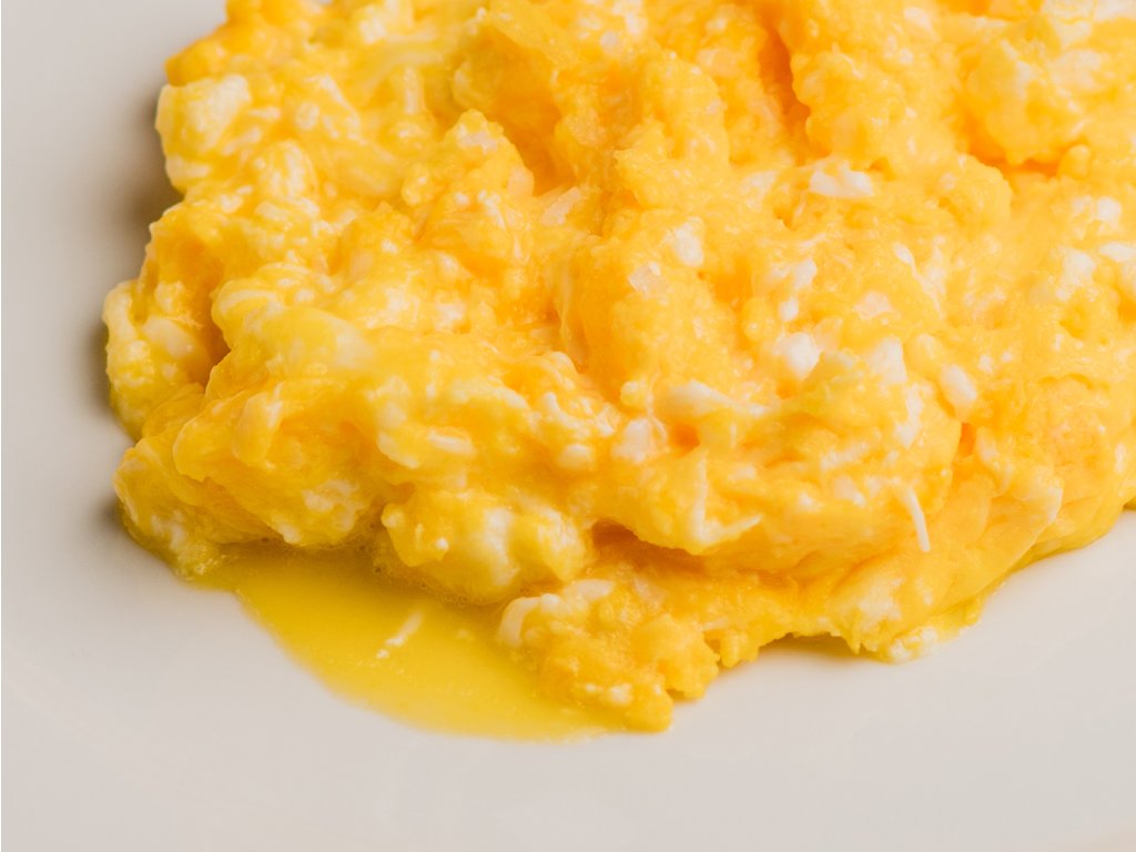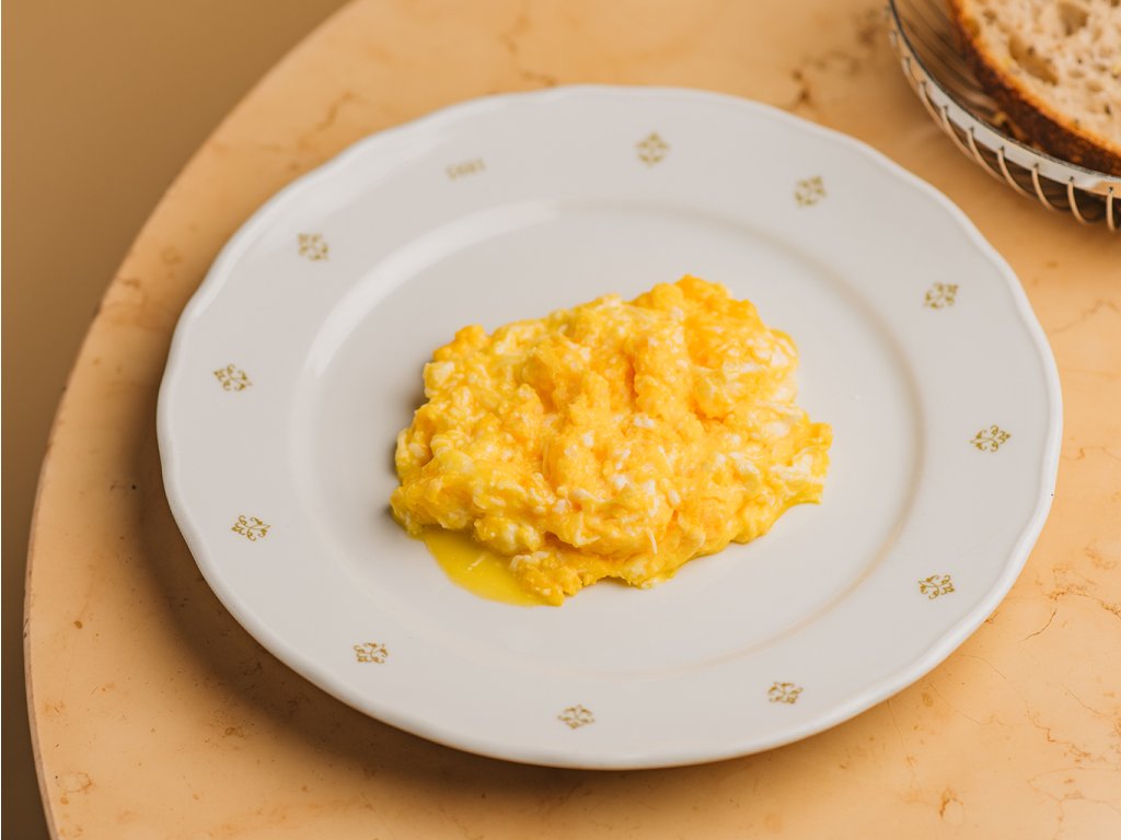 Tři farmářská vejce od Matoušků připravujeme na másle. Podáváme s chlebem z Esky a máslem.