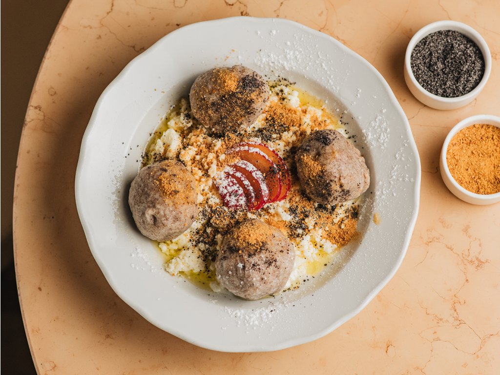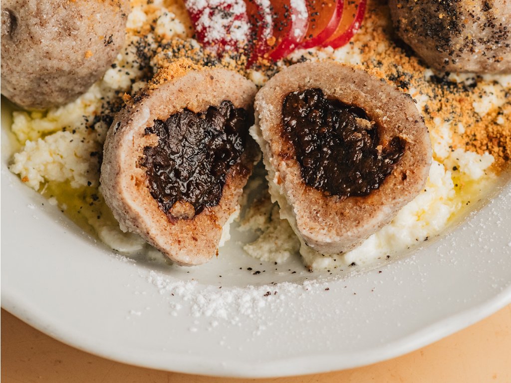 Někdy to chce něco sladkého. Knedlíky děláme z červené pšenice a tvarohu a plníme je sezónním ovocem. Aktuálně je máme se švestkama. Na ně patří už jenom strouhaný tvaroh od pana Kolmana z farmy Krasolesí, cukr a máslo, mák a perník a dokonalost je na světě.